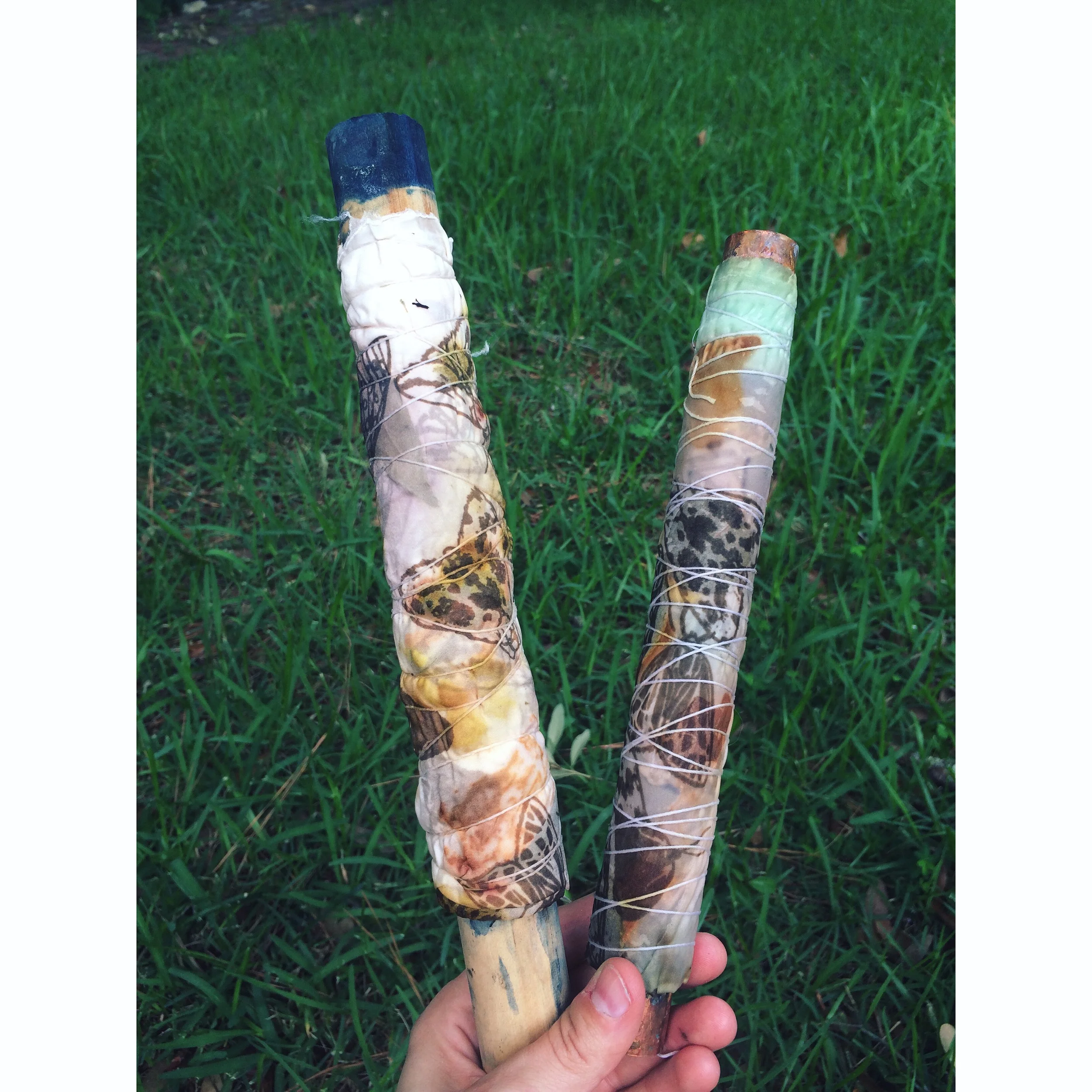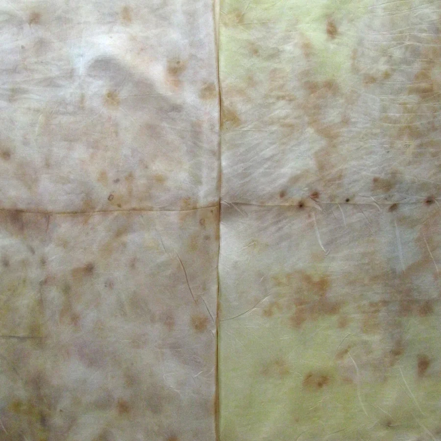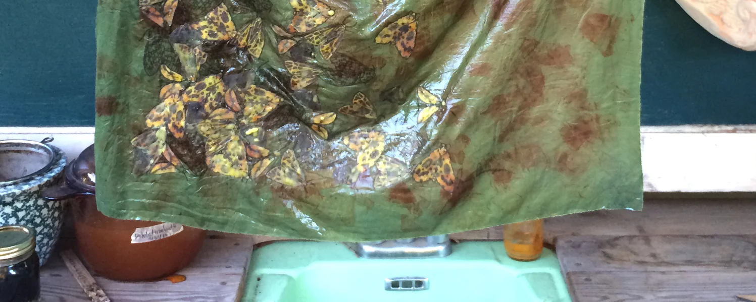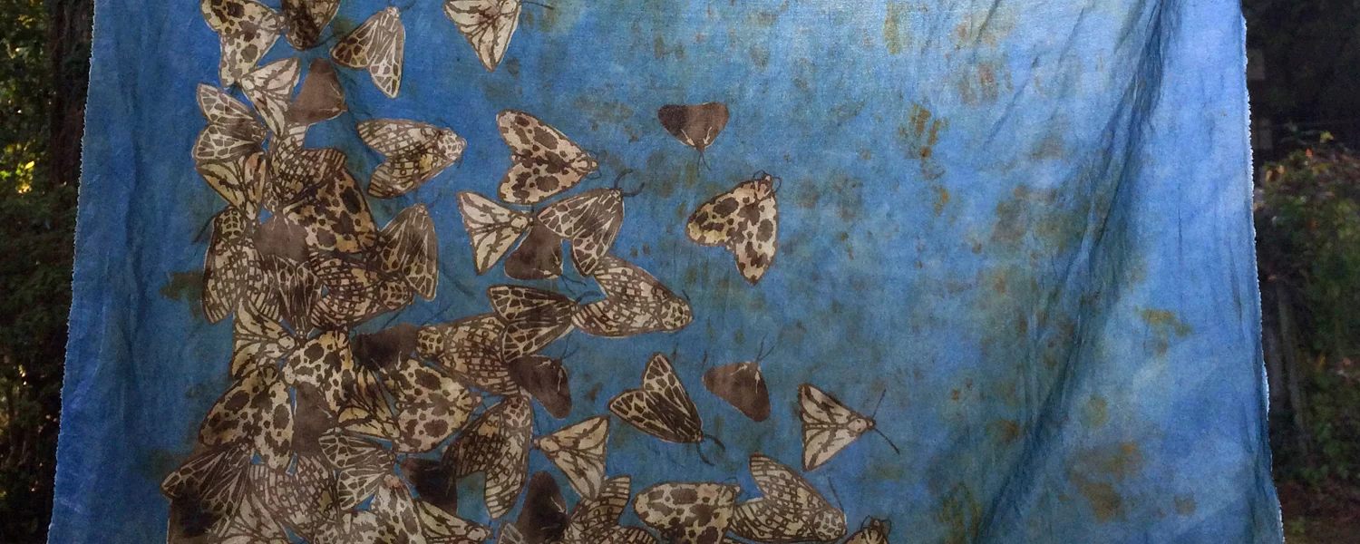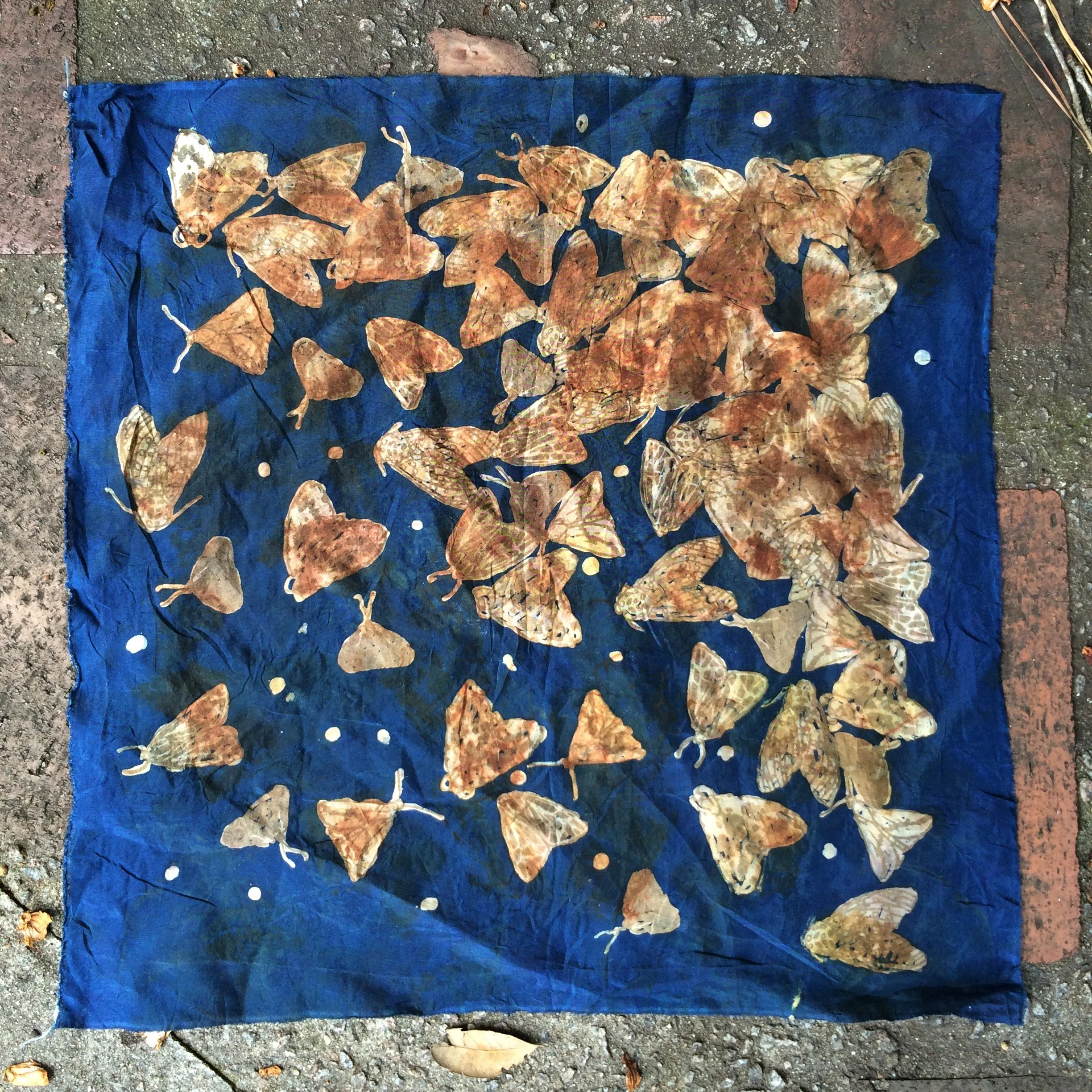I began the Moth series with questions about the science behind natural dyes in mind and techniques I wanted to learn. My primary technique for applying plant color to fabric is through a process called eco-bundling. The plant is placed on wet pre-mordanted fabric, rolled, secured, steamed, and then left to sit for a number of days or weeks. Within this step, I conducted pH balance tests to see how the plant color would be modified in the bundling process. The bundles were then unwrapped and washed. I made a natural dye print paste and used it to screen-print the illustration of moths on each square of silk. The squares were then steamed and washed. At this point, some of the silk squares were deemed finished. I then selected a few to do mordant modification tests, and a few to be batiked and dyed in an organic indigo vat. To finish each silk square, I hand-rolled or hemmed each piece.