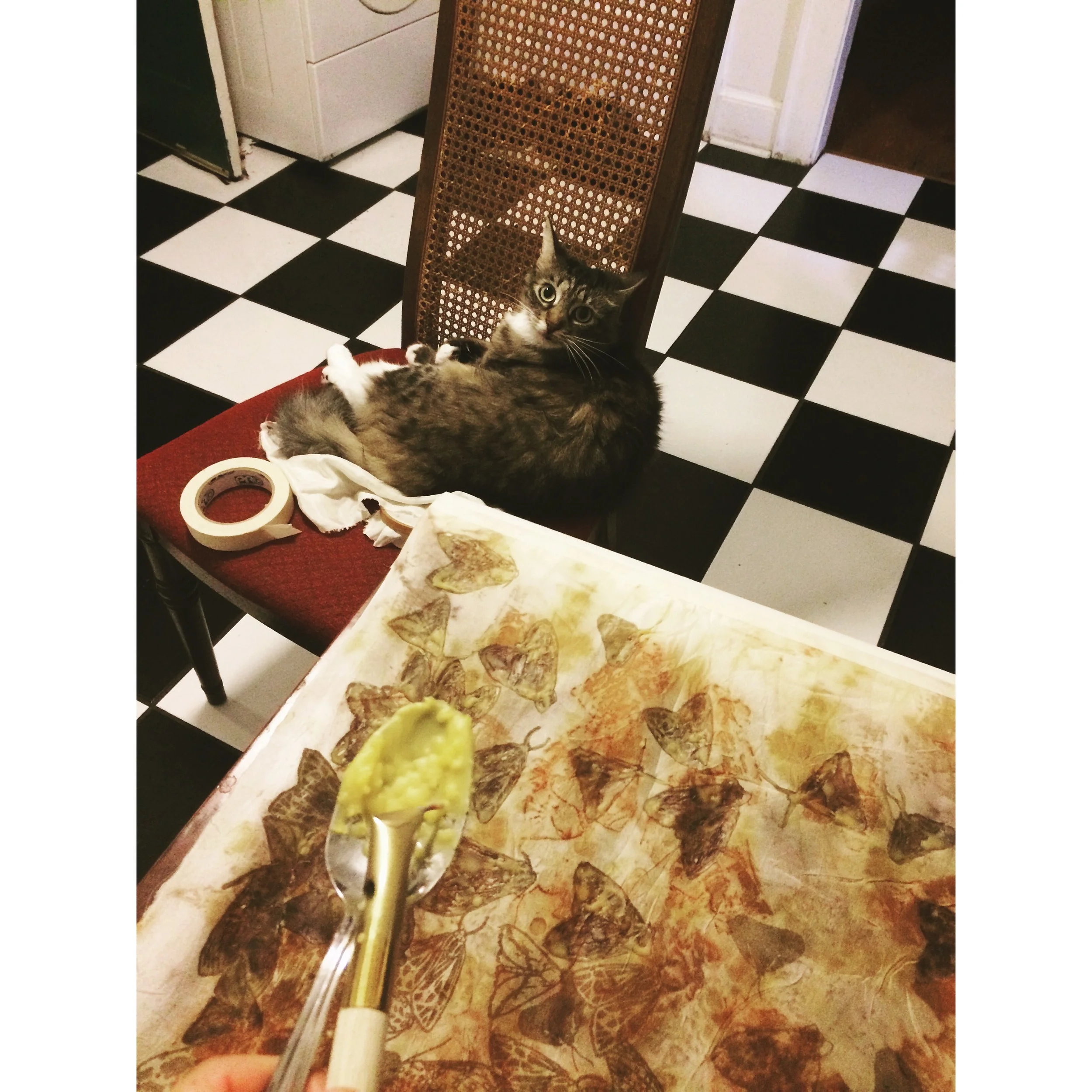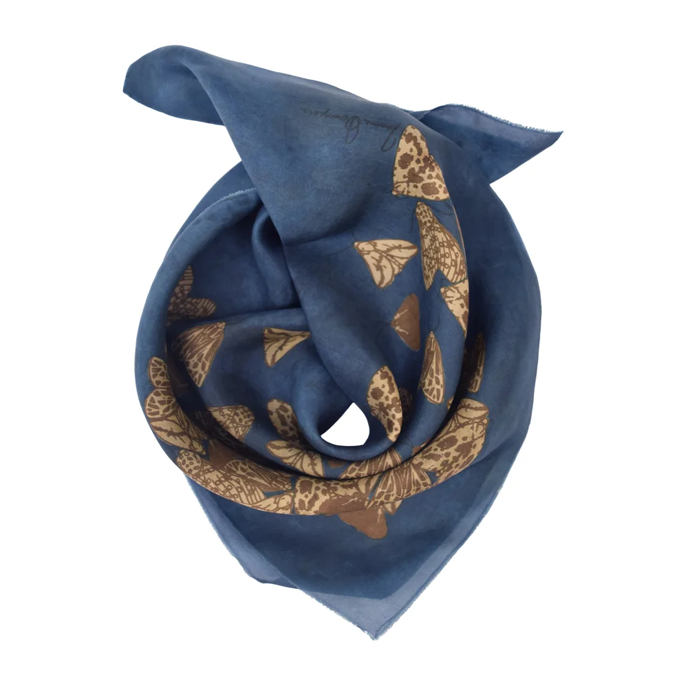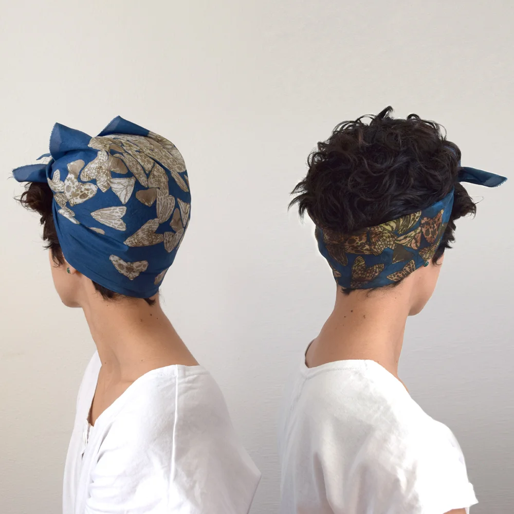 The Moth series scarves were born out of a curiosity and passion for the exploration of the natural dye process. They also represent an integral part of the manifesto of my work, which reflects a central belief that the earth is a living organism upon which every living entity depends on every other living entity for its survival; a concept of no singular species holding the most importance, humans included. The more familiar a person is with something, the more knowledge they gain of it and the more value they place on it, meaning the more fervently they may fight to protect it. Through my illustrations of non-human organisms — moths, in the case of these scarves — I’m hoping to plant the seeds of familiarity, knowledge, and value for less appreciated species, in order to preserve and strengthen the delicate balance of their ecosystems. We can’t positively identify the complete effects a particular species has on its surroundings until it is no longer there. With that being said, I strive for my concepts and art-making practices to be congruous with one another. Through my dedication to translating my illustrations onto natural fibers by harnessing the powers of plant color, I am able to make sure that my practices are as low-impact as possible. I utilize plants from my immediate area by collecting food scraps, harvesting leaves, flowers, nuts, and berries from the local landscape, and growing plants I know to be good dye material. In order to put less waste into the world, every scrap of material I purchase is used in some way. I am constantly researching materials and techniques to ensure that I am developing work using the most ethical goods and processes with the least amount of environmental impact. I believe that the process is just as important as the concept, which is as important as the final product.