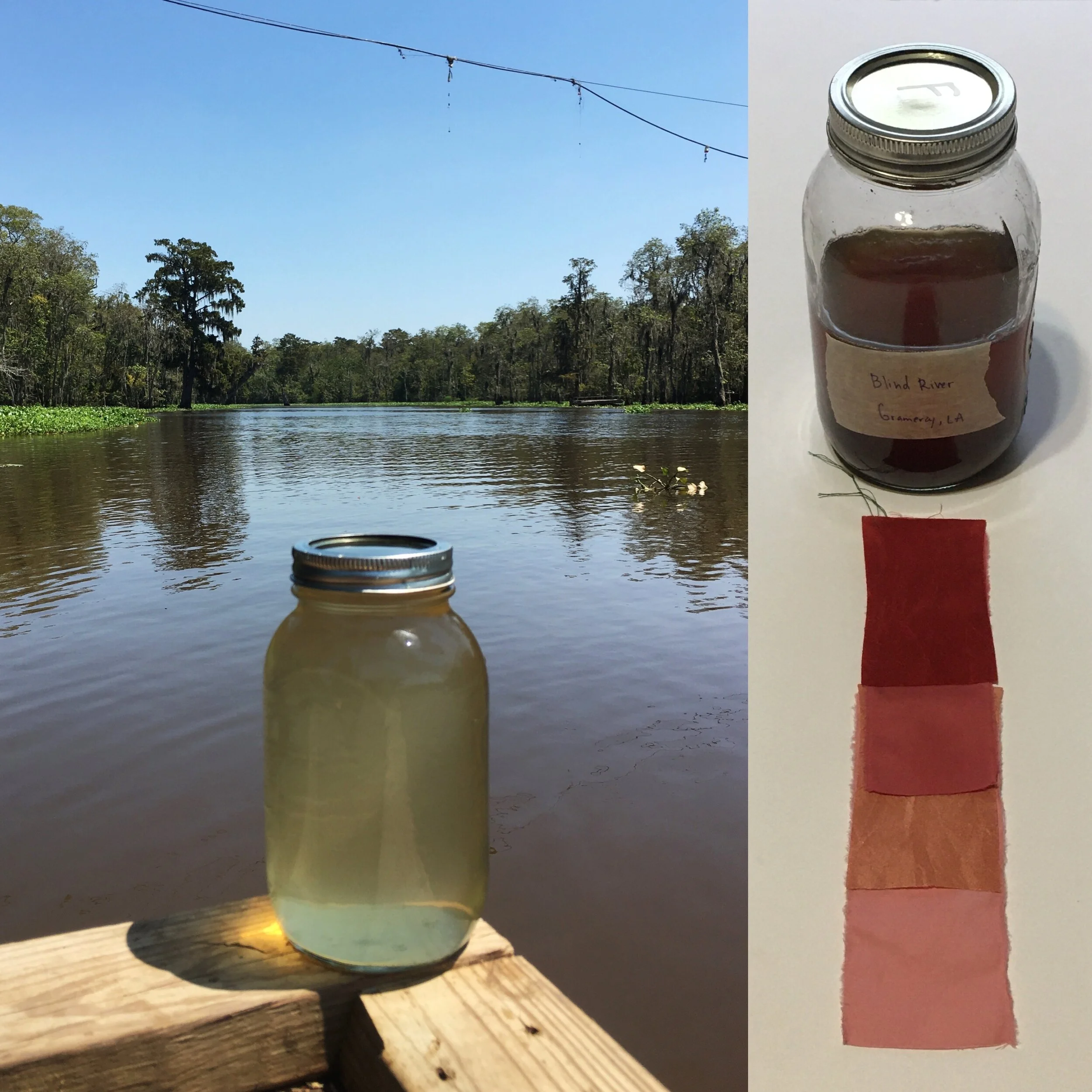 Sample B. Swamp near Barataria Preserve produced dull purples and browns. When I collected this water sample, the water was thick with duckweed. I tried to get as little duckweed in the jar as possible, but some slipped in. Instead of straining out the duckweed, I left it in the jar until right before I added the madder root, about three months later. I recently read that duckweed is a very effective bio-accumulator, often removing excess nutrients and toxic metals from the water. The water is dark because of the presence of iron. I don’t know if the soaking/somewhat decomposing duckweed released iron, creating a slight concentrate in the jar, or if the iron was just this present in the water where I collected the sample. Either way, the duckweed accumulated this iron from its source water. It is also possible that the soaking duckweed released tannin.